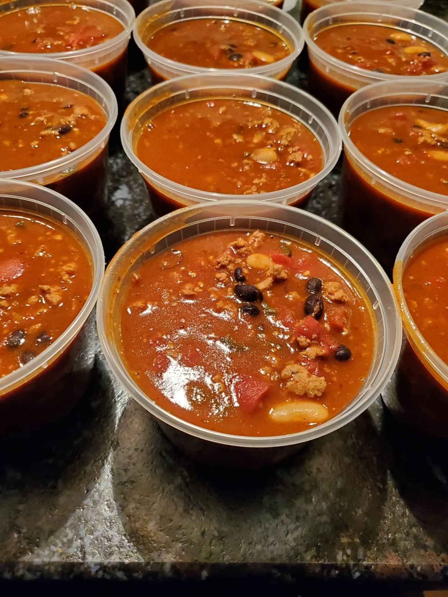Traditional chuck wagon Chili made with black beans, white beans, ground turkey, and a tomato•Chili gravy that's full of flavor.